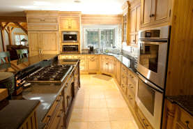 The heart of the Main House is the 21' by 25' Kitchen. Plentiful custom built Old English style knotty pine cabinets and a floor to ceiling pantry and breakfront provide tons of storage. The gourmet appliances include a Thermador double oven, 6 burner Viking down draft gas cook top, Sub Zero refrigerator, Miele dishwasher and Miele auto grind coffee, cappuccino and espresso machine.