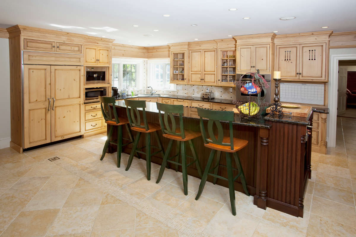 The 10' multi-level working island is topped with Uba Tuba black marble with gold flake accents that matches the other counters. Kitchen flooring is flame edged limestone with natural shell accents. The backsplash is tumbled marble with Uba Tuba granite accents.