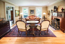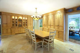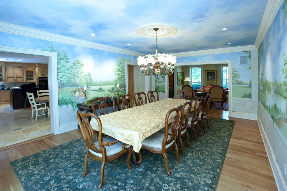 The gracious 21' 4" by 14' 5" Dining Room has a 360 degree floor to ceiling wall mural and the 9' high ceiling is painted to resemble a sky. The recessed chandelier medallion, random width cherry floors, French doors with transom lights all enhance a room that comfortably sits 12 people.