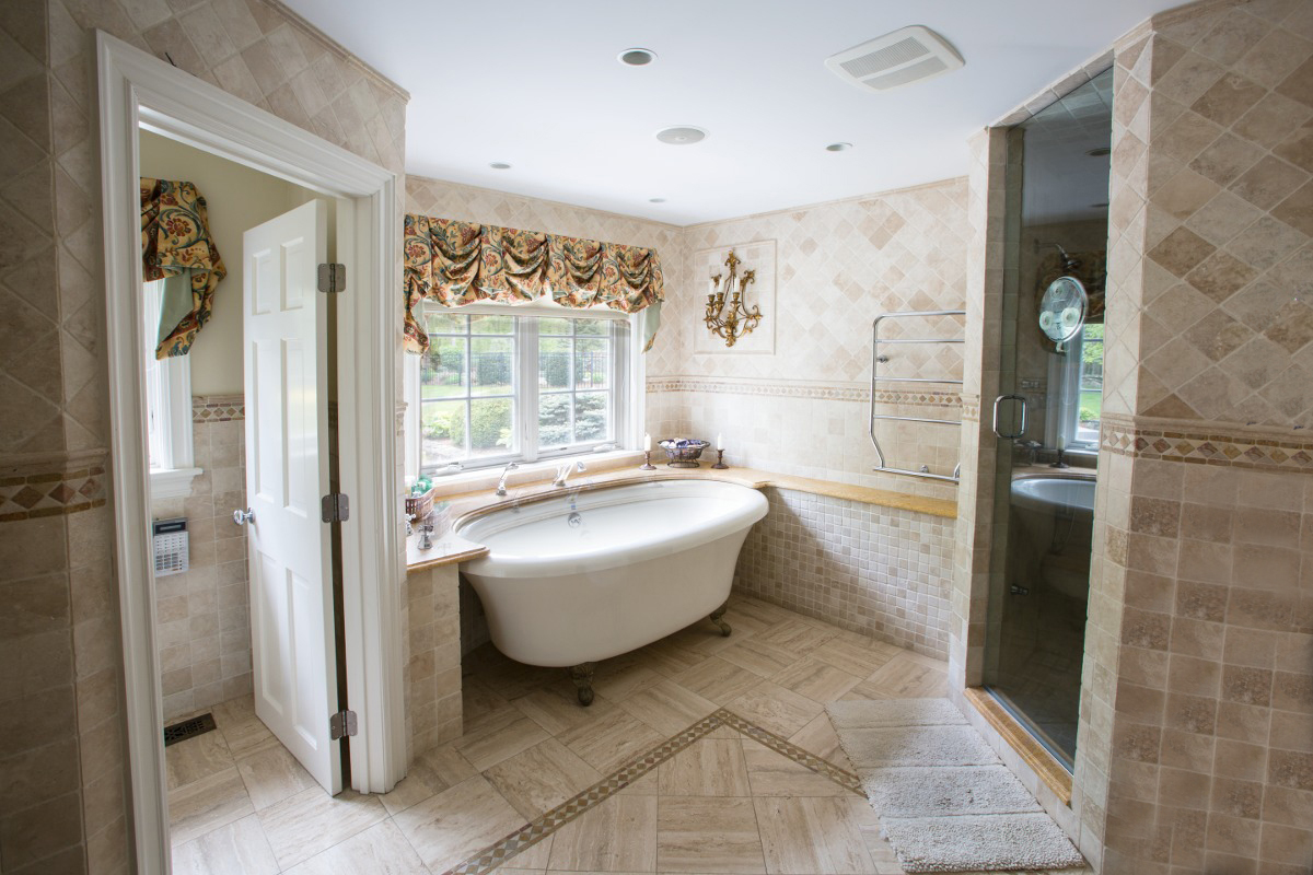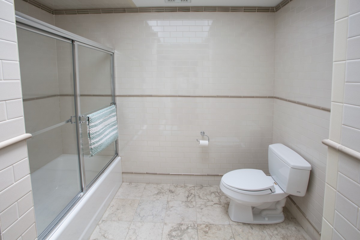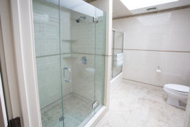 Floor to ceiling white subway tile with a large skylight above help to make this portion of the Full Bathroom light and bright. A bathtub with glass shower doors lets the children splash water in an enclosed area.