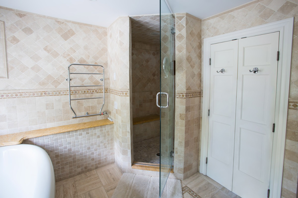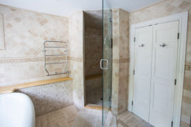 The steam shower has his and hers steam spa controls built into the his and hers shower enclosure. Bench shower has his and hers body wash wall jets and shower head. The electric towel warmer outside will have your towels toasty-warm when done showering.