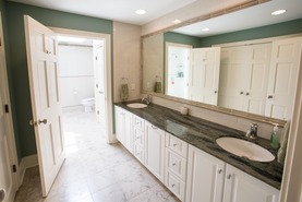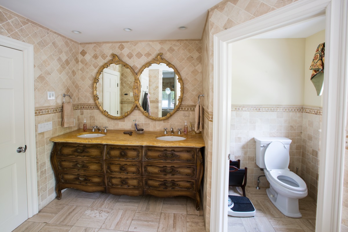 A converted antique Bombay style triple dresser is the base of the his and hers double sinks. A dedicated continuous-loop zone ensures instant hot water at all times. There is polished granite tile on the floor, Heliodor honed-limestone on all horizontal surfaces, floor to ceiling tumbled marble walls with natural-stone chair rail and crown accents.