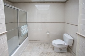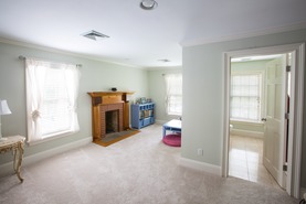This section of the bedroom measures 8'8" by 8' and features a brick fireplace. The 7'9" by 8'4" en-suite full bathroom with bathtub is also located on this side of the room and allows privacy for the user.