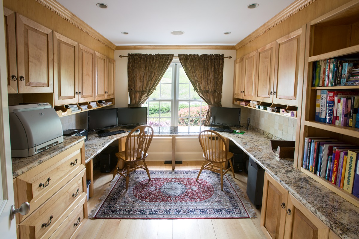 The 10'10" by 9'10" First Floor Office has 2 computer work stations, custom built-in upper and lower maple cabinets and hanging file drawers, granite counter tops and a tumbled marble backsplash. Not only is there recessed LED lighting, but under cabinet halogen accent lighting, too. Data outlets for fax and printers and house wide server hub to make things easier.