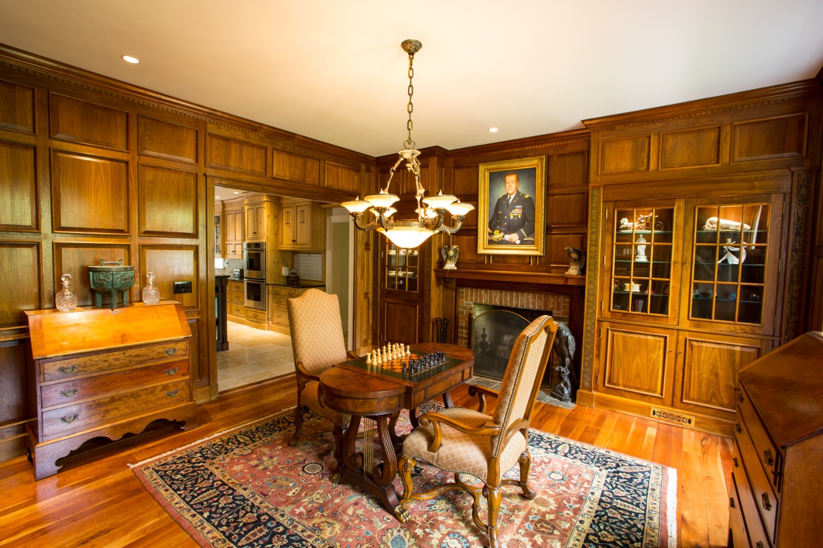 The highlight of the 14'8" by 15'8" Library is the custom-built floor to ceiling solid black-walnut raised panels, matching built-in floor to ceiling solid black-walnut bookshelves with matching 4" dentil crown moldings. The brick fireplace with slate stone hearth and walnut mantle sits between 2 lighted built-in glass display walnut cabinets.